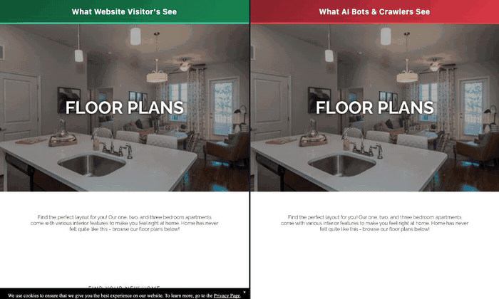 LLM crawlers don't render JavaScript, which means your dynamic pricing grid, your interactive floor plans, your availability widget are all potentially invisible. Our team recently pulled up a side-by-side of what a human sees on a property site versus what an AI crawler sees on the same page. The human sees full pricing, unit details, availability. The AI sees a few sentences. If your most important information only exists inside JavaScript widgets, no amount of SEO spending will fix it.